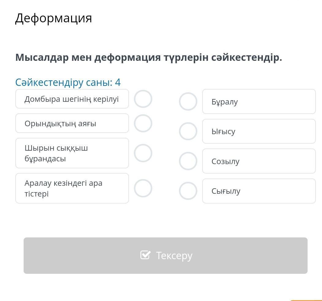 Мысалдар мен деформация түрлерін сәйкестендір. Сәйкестендіру саны: 4 Домбыра шегінің керілуі Орындықтың аяғы Шырын сыққыш бұрандасы Аралау кезіндегі ара тістері Бұралу Ығысу Созылу Сығылу помогите пжж