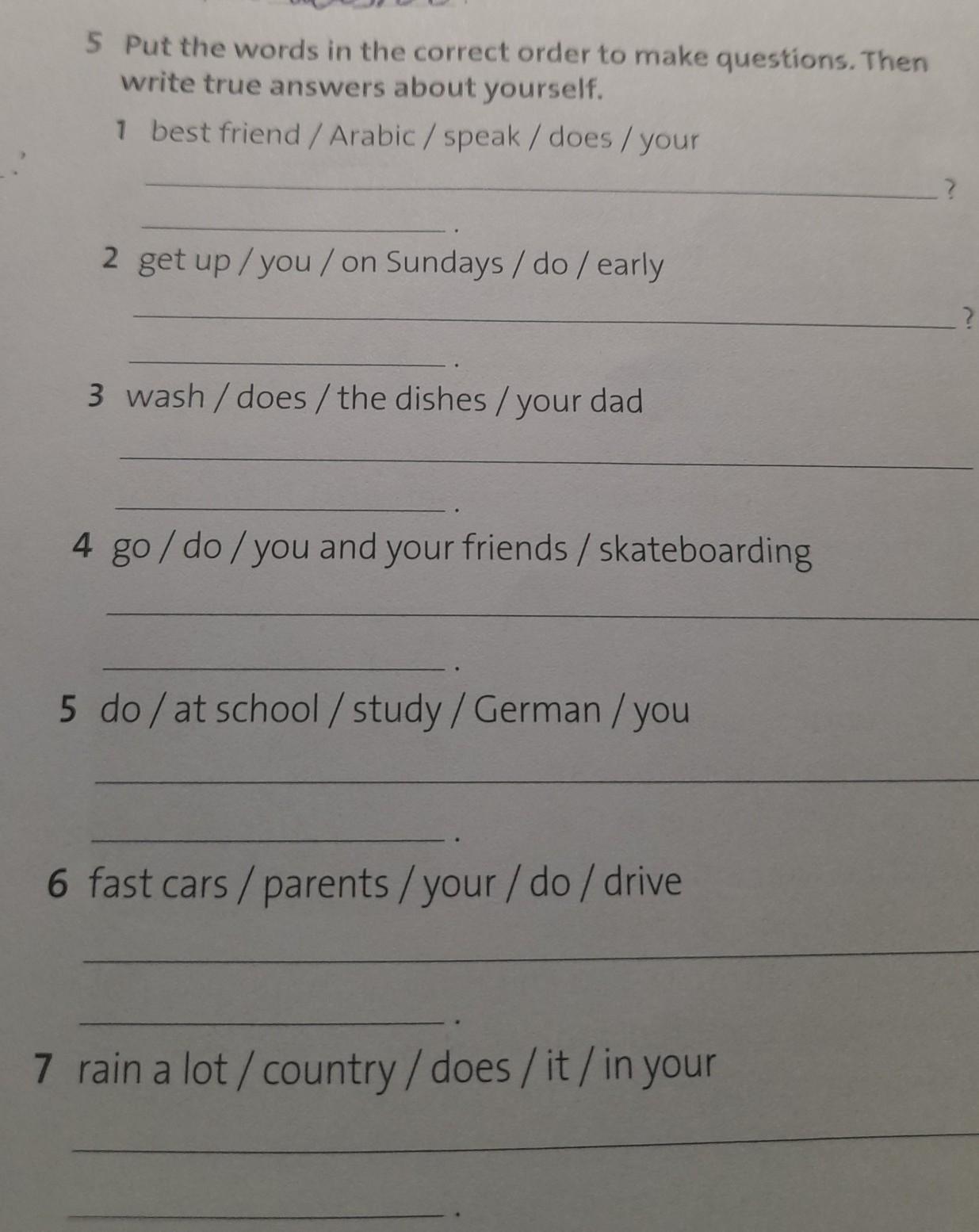 Объяснение: 1Does your best friend speak Arabic 2 Do you get up early on Sunday 3 Does your dad wash the dishes 4 Do you and your friends go skateboarding 5 Do you study at school German 6 Do your parents drive fast cars 7Does rain a lot in your country
