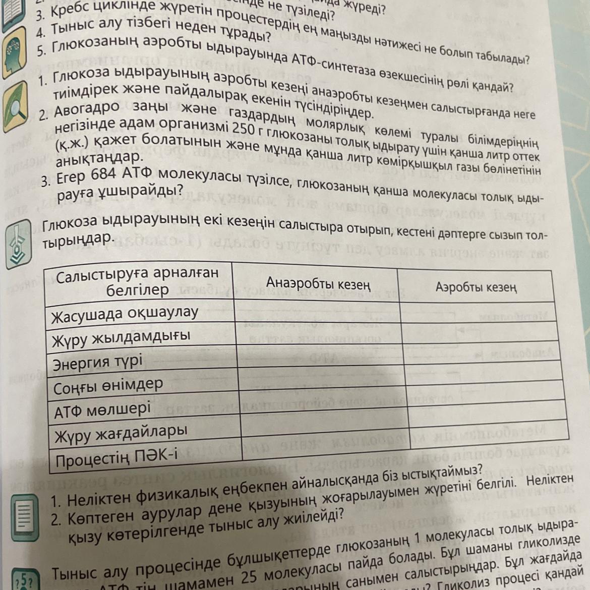 Глюкоза ыдырауының екі кезеңін салыстыра отырып, кестені дәптерге сызып тол-