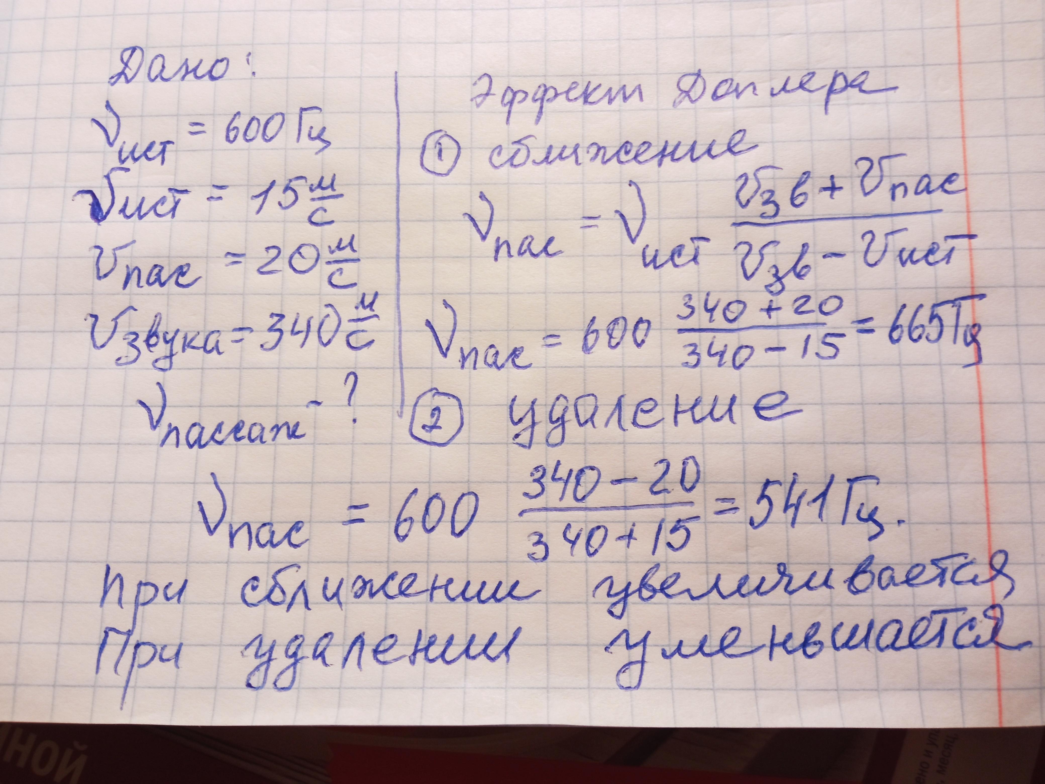Два поїзди рухаються назустріч один одному зі швидкостями 20 м/с і 15 м/с. Другий поїзд подає звуковий сигнал, частота якого 600 Гц. Швидкість звуку в повітрі дорівнює 340 м/с. Звук якої частоти чує пасажир першого поїзда: 1) при наближенні поїздів; 2) при їх віддаленні?
