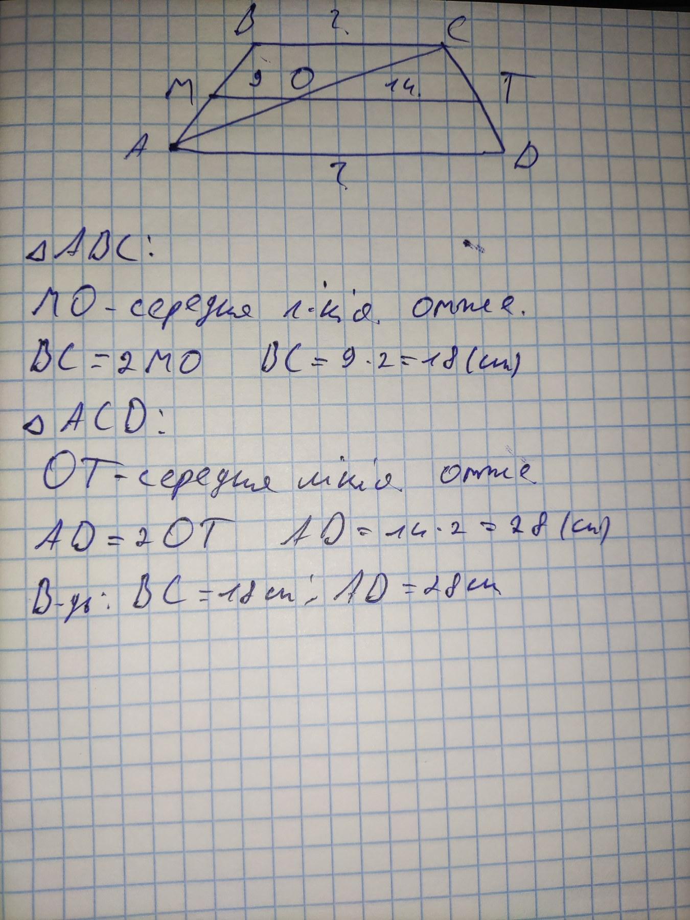 №2 MT-середня лiнiя трапеції ABCD (ABI CD - основи). Діагональ АС ділить середню лінію на відрізки довжиною 9 см і 14 см. Знайдіть довжини основ.