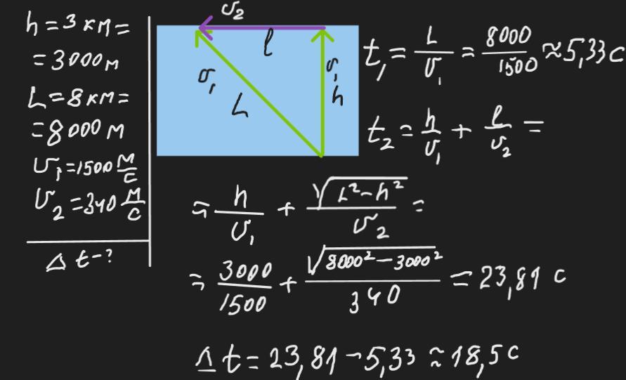 В океані на невеликій глибині здійснили вибух. Глибина океану неподалік місця вибуху дорівнює 3 км. Гідроакустики на кораблі, що перебував на відстані 8 км від місця вибуху, зафіксували два звукові сигнали. Через який проміжок часу після прийняття першого сигналу прийшов другий? Швидкість звуку у воді дорівнює 1500 м/с.