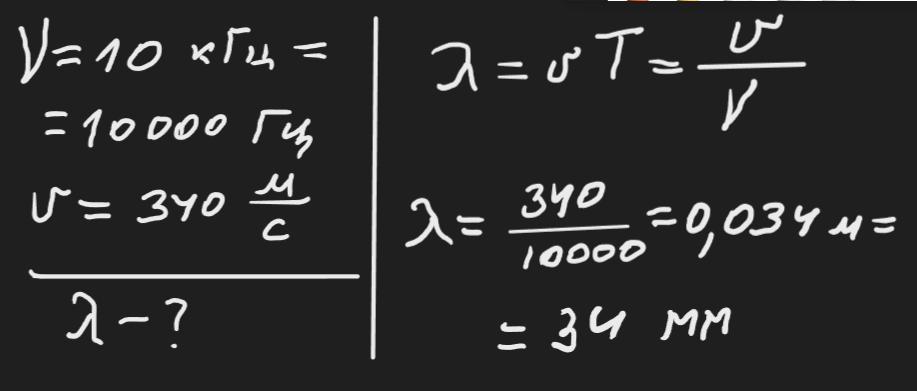 хелпаните плиз с обьяснением ибо я чайник! Визначте довжину звукової хвилі частотою 10 кГц у повітрі, якщо швидкість звукової хвилі в повітрі = 340 м\с.