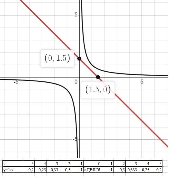 y=1.5-x; при х=0 у=1,5; при у=0 х=1,5.