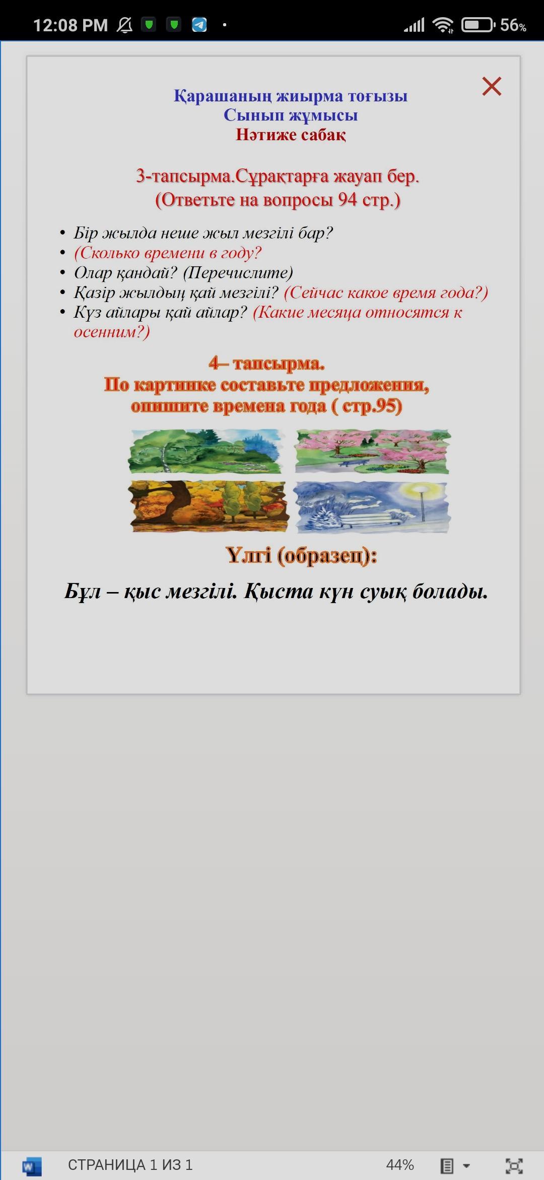 2. Қыс мезгілі,жылы киіну керек.Көктем мезгілі,табиғат гүлденуде. осы жаз келе жатыр жазғы демалыс. күзде оқу жылы басталады
