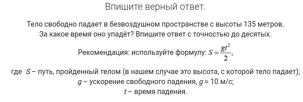 Впишите верный ответ. Тело свободно падает в безвоздушном пространстве с высоты 135 метров. За какое время оно упадёт? Впишите ответ с точностью до десятых. Рекомендация: ИСПОЛЬЗУЙТе формулу: S = gt 2 где S - путь, пройденный телом (в нашем случае это высота, с которой тело падает); g-ускорение свободного падения, g ≈ 10 м/с; t - время падения.