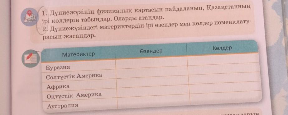 Дам 30 баллов 1. Дүниежүзінің физикалық картасын пайдаланып, Қазақстанның iрi көлдерiн табыңдар. Оларды атаңдар. 2. Дүниежүзіндегі материктердің ірі өзендер мен көлдер номенклату- расын жасаңдар.