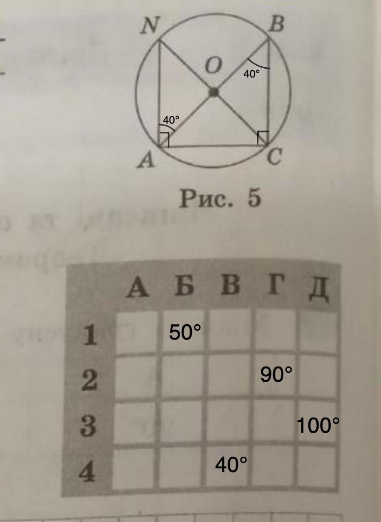 Установить соответствие между центральными и вписанными углами (1-4) и их градусными мерами (А-Д), если AB, NC - диаметры окружности (рис. 5).