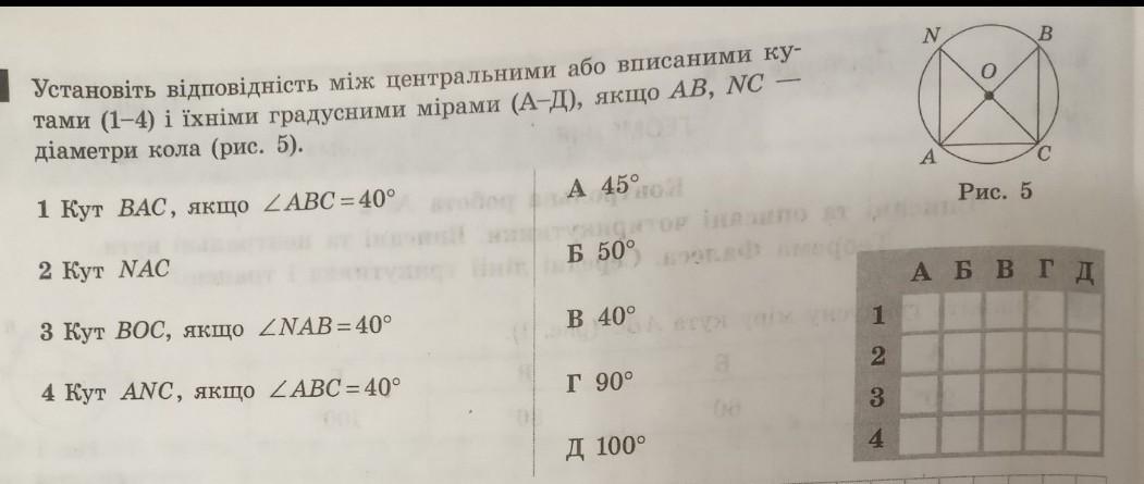 Установіть відповідність між центральними або вписаними кутами (1-4) і їхніми градусними мірами (А-Д), якщо AB, NC - діаметри кола (рис. 5).