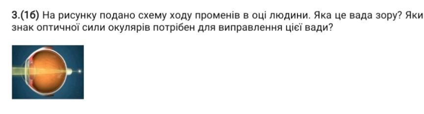На рисунку подано схему ходу променів в оці людини. Яка це вада зору? Який знак оптичної сили окулярiв потрібен для виправлення цiєï вади?