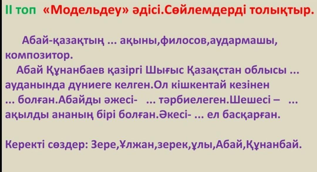 «Модельдеу» әдісі.Сөйлемдерді толықтыр. Абай-қазақтың ... ақыны,филосов, аудармашы, композитор. Абай Құнанбаев қазіргі Шығыс Қазақстан облысы ... ауданында дүниеге келген.Ол кішкентай кезінен ... болған.Абайды әжесі- ... тәрбиелеген.Шешесі - ақылды ананың бірі болған.Әкесі-... ел басқарған.