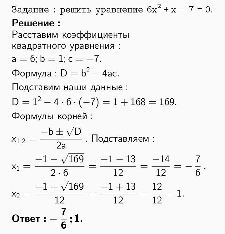 D = b^2 - 4ac = 1^2 - 4 × 6 × (-7) = 1 + 168 = 169 > 0 , 2 корня