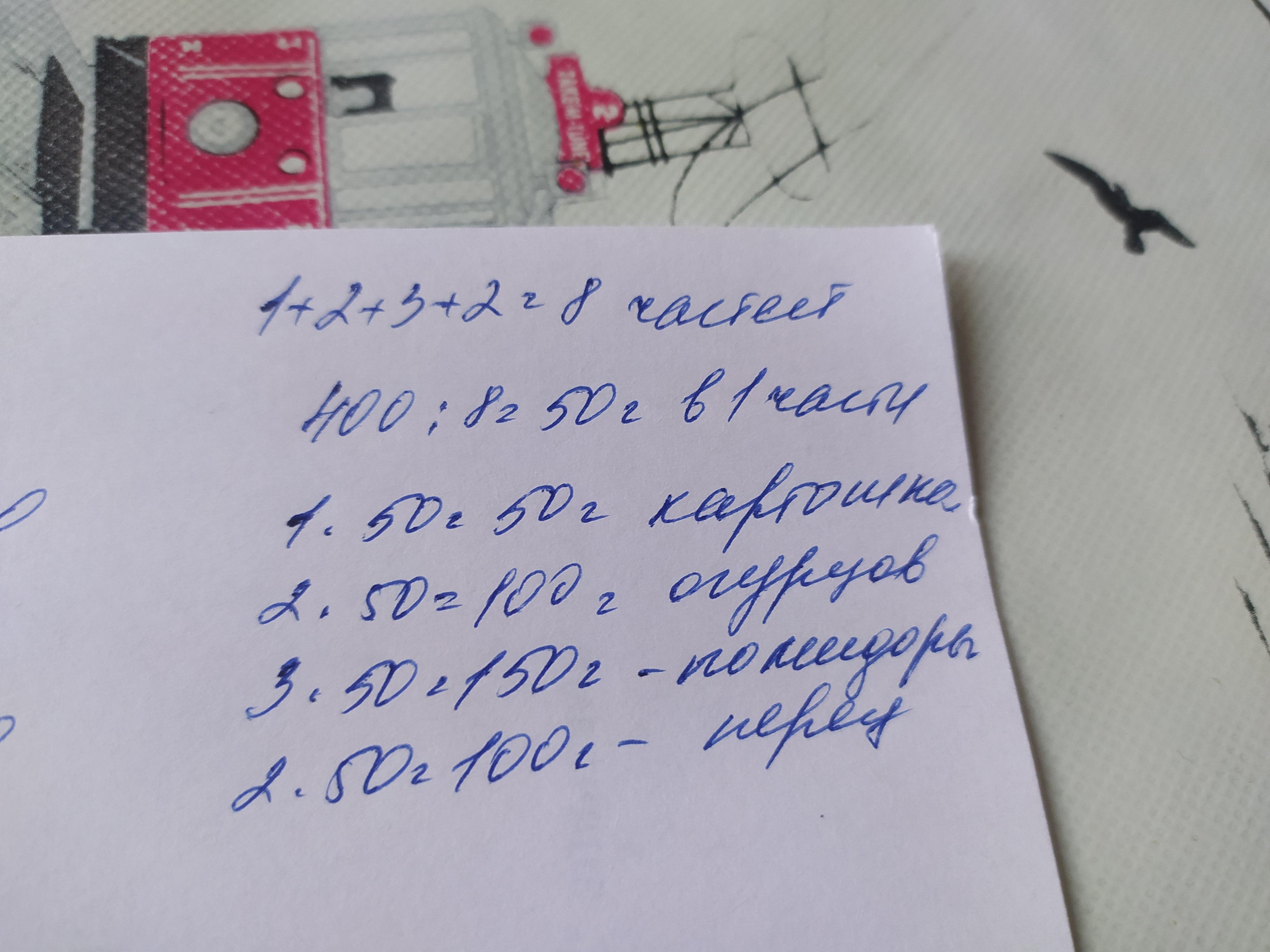 салат весняний містить цибулю огірки помідори солодкий перець у відношенні 1:2:3:2. скільки треба взяти цих складників щоб отримати 400 грамм салату