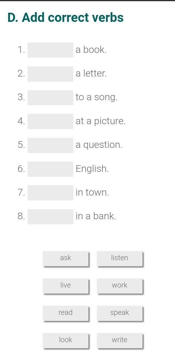 D. Add correct verbs 1. 2. 3. 4. 5. 6. 7. 8. ask live read look a book. a letter. to a song. at a picture. a question. English. in town. in a bank. listen work speak write