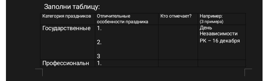 Государственные праздники: день Конституции РК, день первого призедента 1 декабря, 9 мая день победы