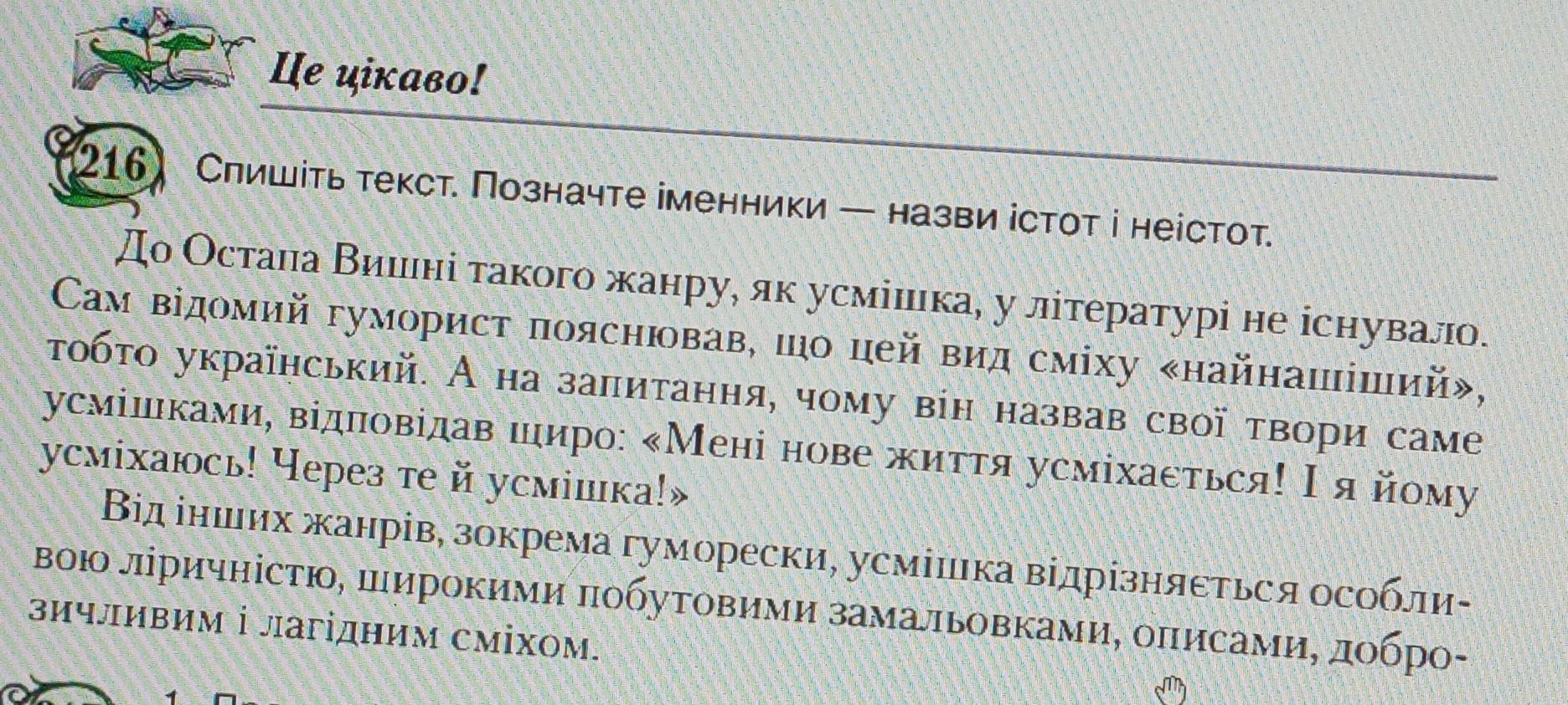 216 Спишіть текст. Позначте іменники — назви істот і неістот