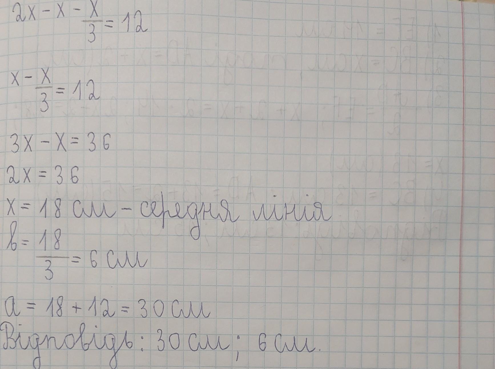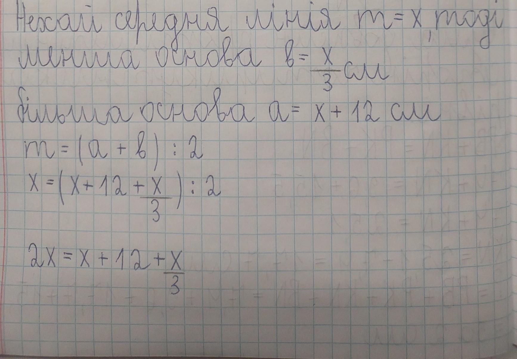 Середня лінія трапеції 3 рази більша за меншу основу і на 12 см менша за більшу основу. Знайти основи трапеції.