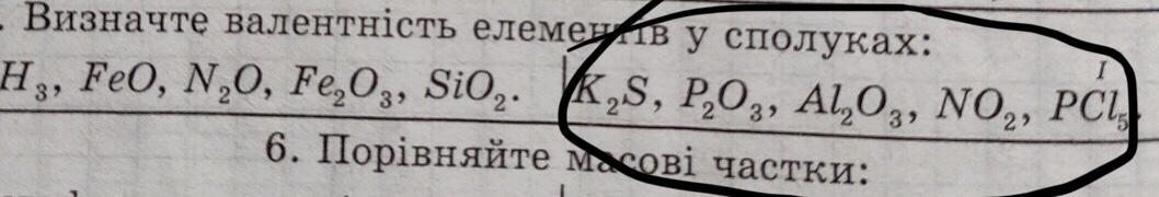 5. Визначте валентність елементів у сполуках: K_{2}*S, P_{2}*O_{3} , A*l_{2}*O_{3} , N*O_{2} I PC*l_{5} 6 Honi