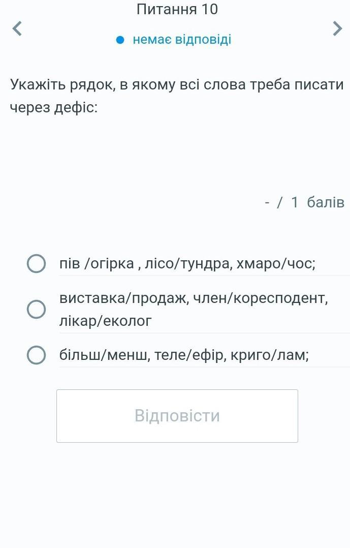 Укажіть рядок, в якому всі слова треба писати через дефіс: - / 1 балів О пів /огірка, лісо/тундра, хмаро/чос; виставка/продаж, член/коресподент, лікар/еколог більш/менш, теле/ефір, криго/лам;