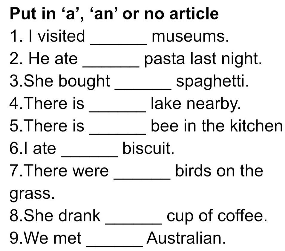 Put in 'a', 'an' or no article 1. I visited museums. 2. He ate pasta last night. 3.She bought spaghetti. 4.There is lake nearby. 5.There is bee in the kitchen. 6.1 ate 7.There were grass. 8.She drank 9.We met biscuit. birds on the cup of coffee. Australian.