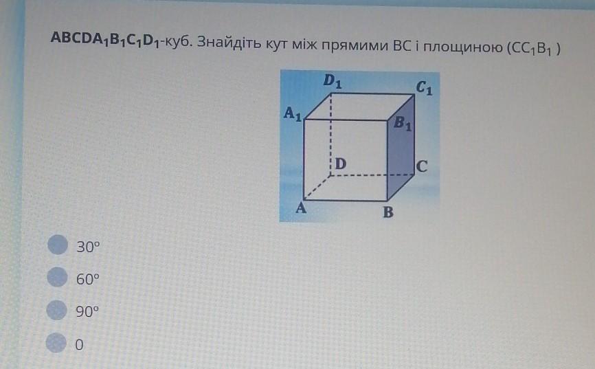 ABCDA1B1C1D1-куб. Знайдіть кут між прямими ВС і площиною (СС1В1 )