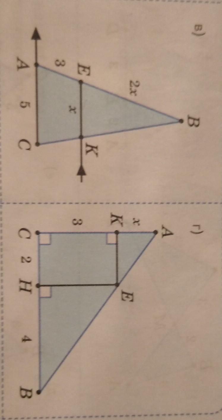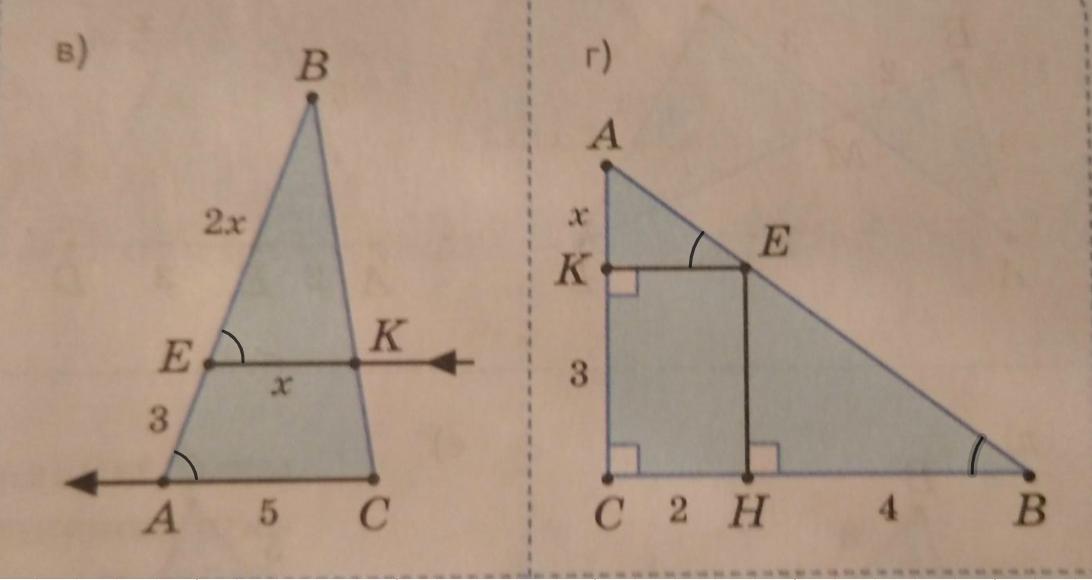 Укажите подобные треугольники на рисунке 27, а-м и найдите длину отрезка, обозначенную на каждом из рисунков буквой х. На рисунках в пунктах a, в, u , к стрелками указаны параллельные прямые.