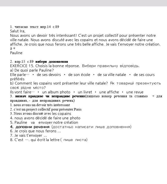 1. читаемо текст впр. 14 с.89 Salut Ira, Nous avons un devoir très interessant! C'est un projet collectif pour présenter notre ville natale. Nous avons discuté avec les copains et nous avons décidé de faire une affiche. Je crois que nous ferons une très belle affiche. Je vais t'envoyer notre création. à+ Pauline 2. впр.15 с.89 вибери доповнення EXERCICE 15. Choisis la bonne réponse. Вибери правильну відповідь. a) De quoi parle Pauline? Elle parle... . de ses devoirs . de son école . de sa ville natale préférés b) Comment les copains vont présenter leur ville natale? Як товариші презентують своє рідне місто? . . IIs vont faire... un album photo un livret une affiche une revue 3. визнач правдиве чи неправдиве речення(пишемо номер речення та ставимо правдивих,- для неправдивих речень) 1. nous avons un devoir très intéressant 2. c'est un project collectif pour présenter Paris 3. Nous avons discuté avec les copains . . . de ses cours 4. nous avons décidé de faire une photo 5. Pauline va envoyer notre création 4. доповни речення (достатньо написати лише доповнення) 6. Je crois que nous ferons ... 7. Je vais t'envoyer ... 8. C'est ... qui écrit la lettre ( пише листа) + для допоможіть будь ласка