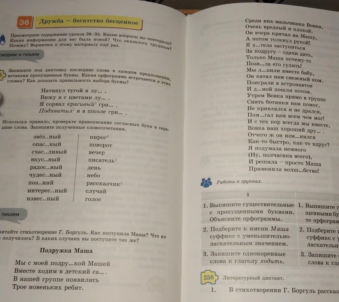 Работа в группах. 1. Выпишите глаголы с пропущенными буквами. Объясни- те орфограммы. 2. Подберите к имени Вовка суффикс с уменьшительно- ласкательным значением. 3. Запишите однокоренные слова к глаголу дать.(текст «подружка Маши»)