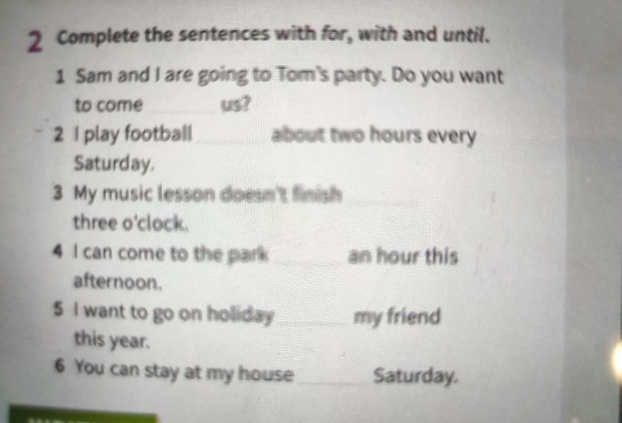 2 Complete the sentences with for, with and until. 1 Sam and I are going to Tom's party. Do you want to come 2 I play football Saturday, 3 My music lesson doesn't finish three o'clock. 4 I can come to the park about two hours every afternoon. 5 I want to go on holiday this year. 6 You can stay at my house WRITING an hour this my friend Saturday.