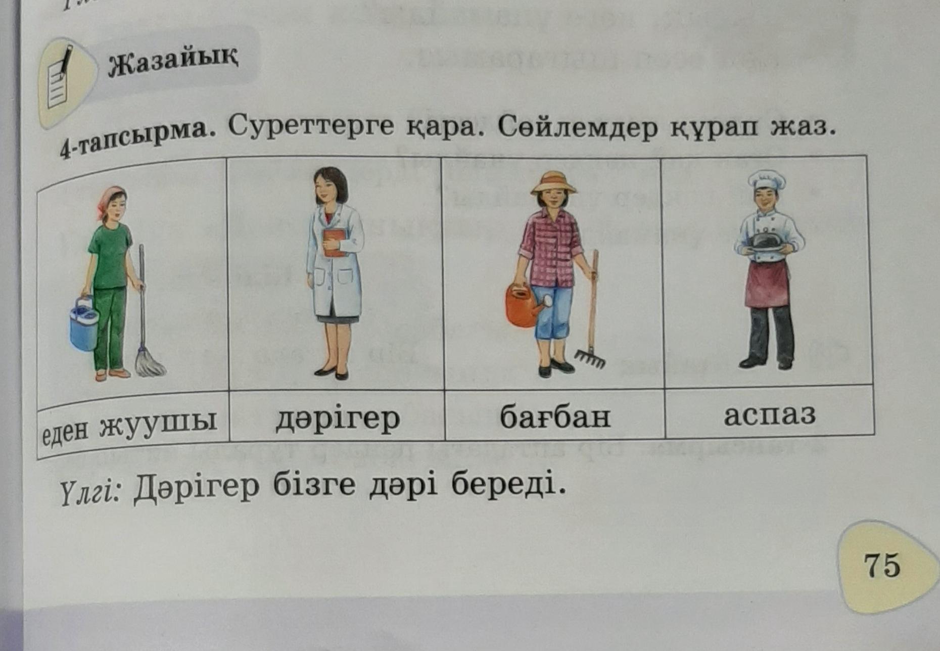Дәрігер бізге көмек береді,бізге иммунитеті жақсартады және олар біздің денсаулықтағы ең бастысы. Бағбан бидай егеді және шөп сияқты кез келген өсімдікті немесе отырғызуға болатындығынды салады.Аспаз біздің қарнының немесе мектепте,ғимараттарда,жұмыстарда т.б жерлерде аспаз болмаса біздің қарнын ғана емес күші азаяды.