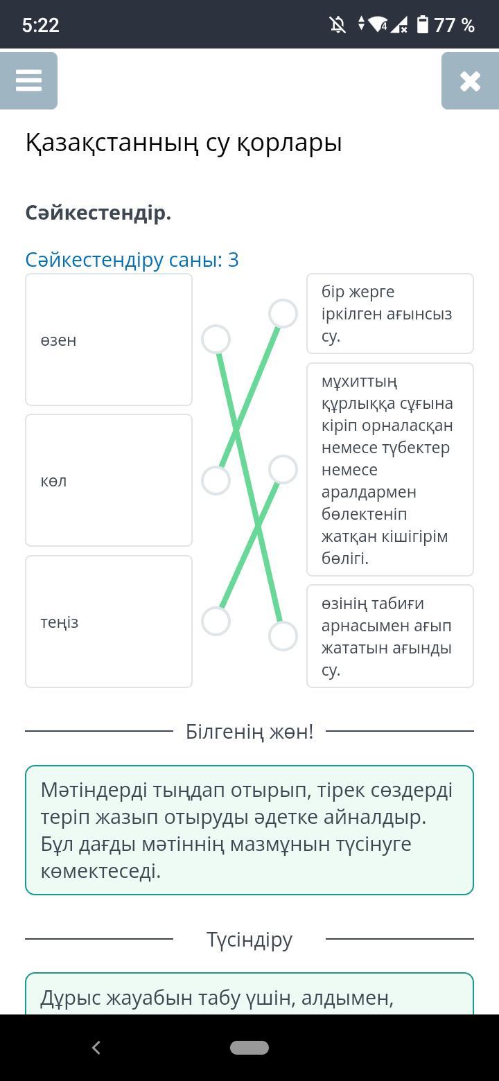 сәйкестендір. Сәйкестендіру саны: 3 өзен көл теңiз бір жерге iркiлген ағынсыз су. мұхиттың құрлыққа сұғ ына кіріп орналасқан немесе түбектер немесе аралдармен бөлектеніп жатқан кішігірім бөлігі. өзінің табиғи арнасымен ағып жататын ағынды су.