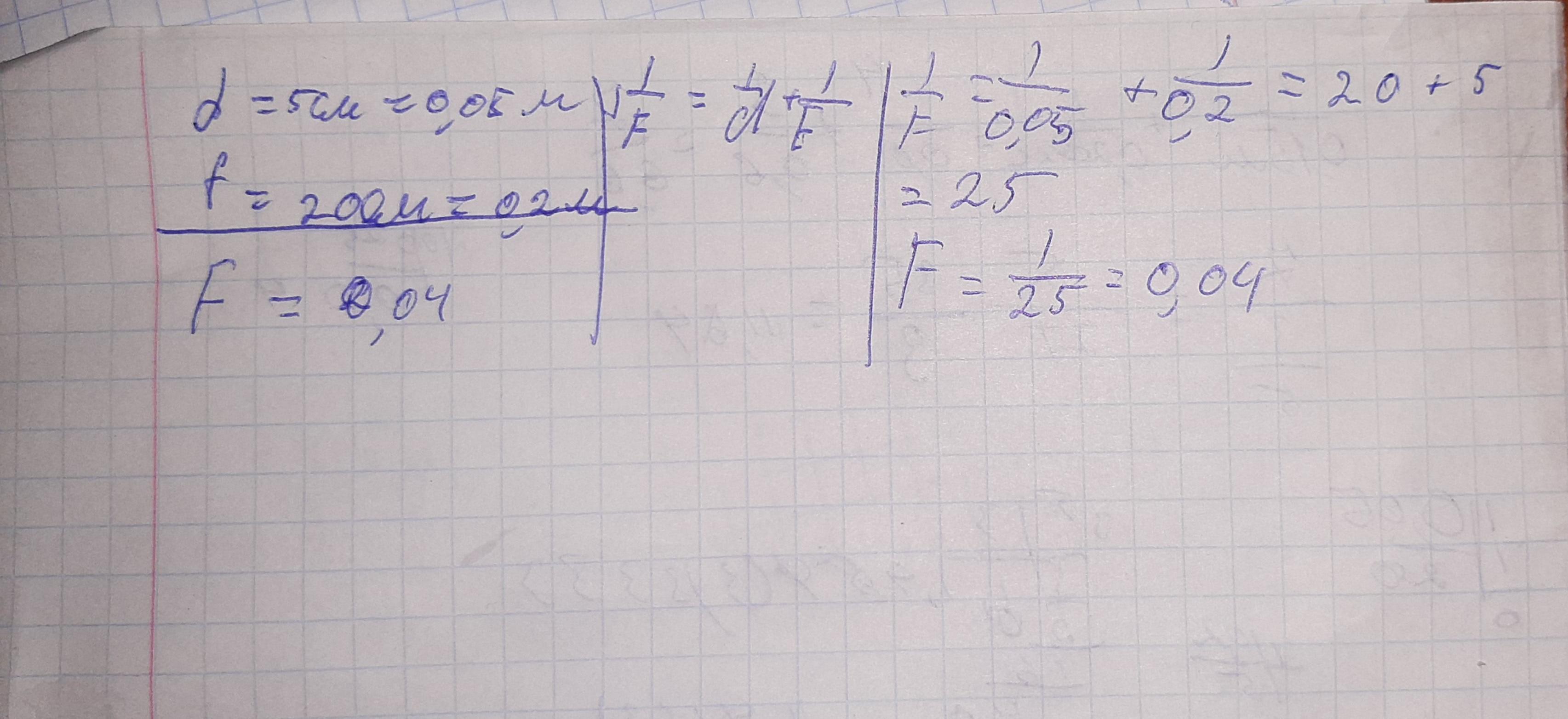 Відстань від предмета до збиральної лінзи 5 см відстань від лінзи до зображення 20 см. яка фокусна відстань збиральної лінзи
