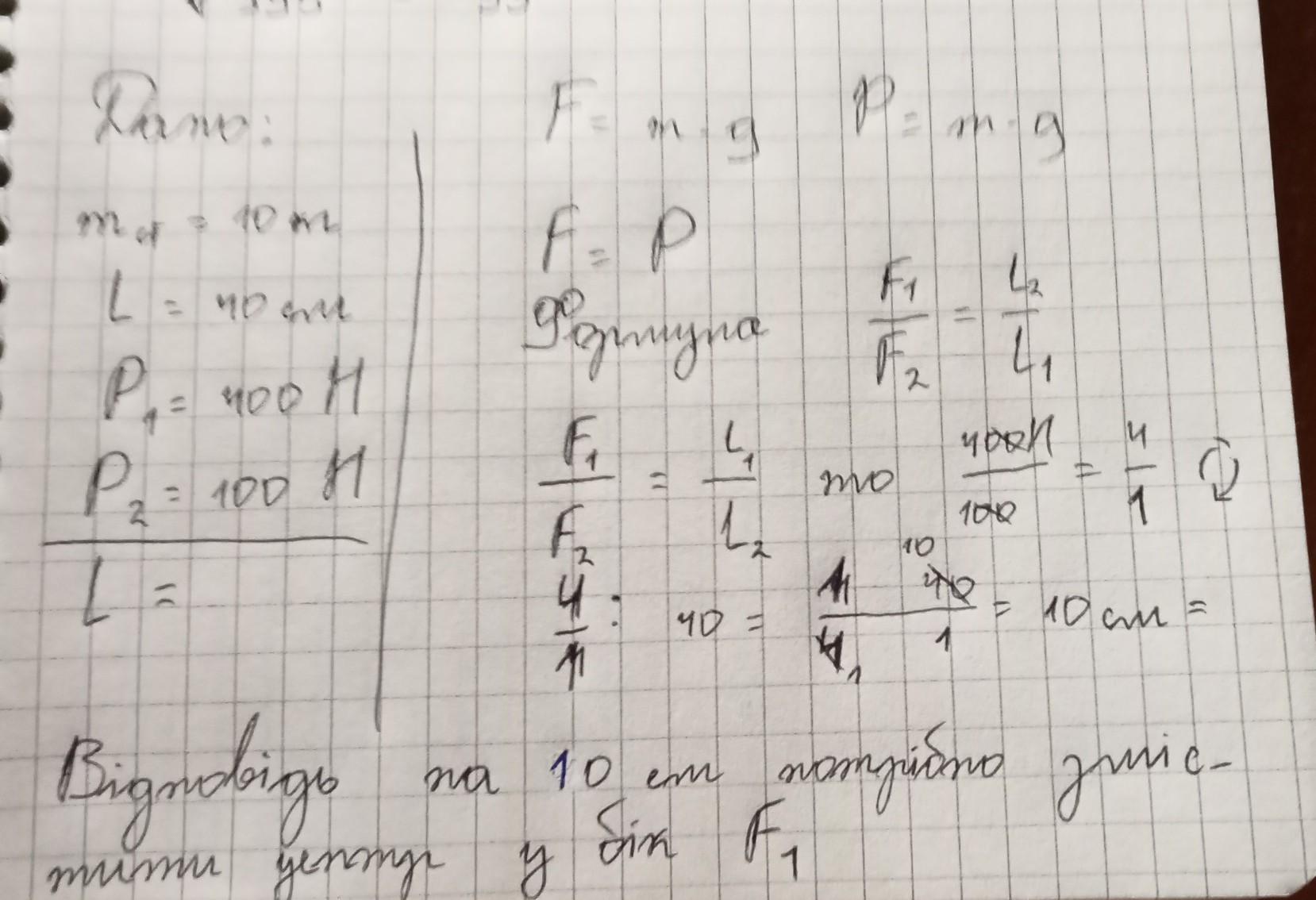 До кінця стержня масою 10 кг і завдовжки 40 см підвішені вантажі P₁ 400 Hi P2 = 100 Н. У якому місці потрібно підперти стержень, = щоб він перебував в рівновазі?