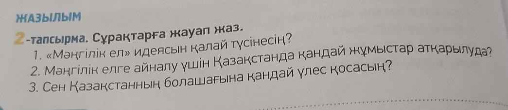 -тапсырма. Сұрақтарға жауап жаз. 1. «Мәңгілік ел» идеясын қалай түсінесің? 2. Мәңгілік елге айналу үшін Қазақстанда қандай жұмыстар атқарылуда? 3. Сен Қазақстанның болашағына кандай үлес қосасың? дам 20 баллл