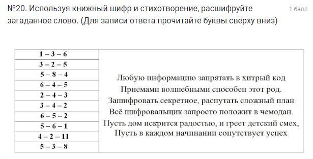 №20. Используя книжный шифр и стихотворение, расшифруйте загаданное слово. (Для записи ответа прочитайте буквы сверху вниз)