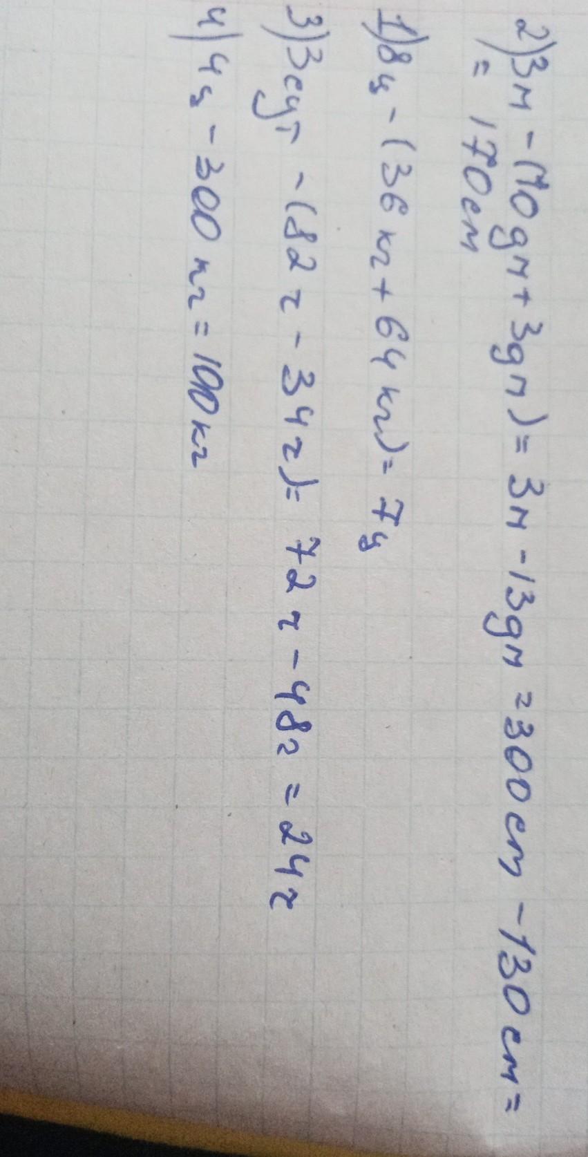 8. Выполни действия. 8 ц - (36 кг + 64 кг) 3 м - (10 дм + 3 дм) - (82 ч - 34 ч) кг 3 сут 4 ц - 300 помогите пожалуйста