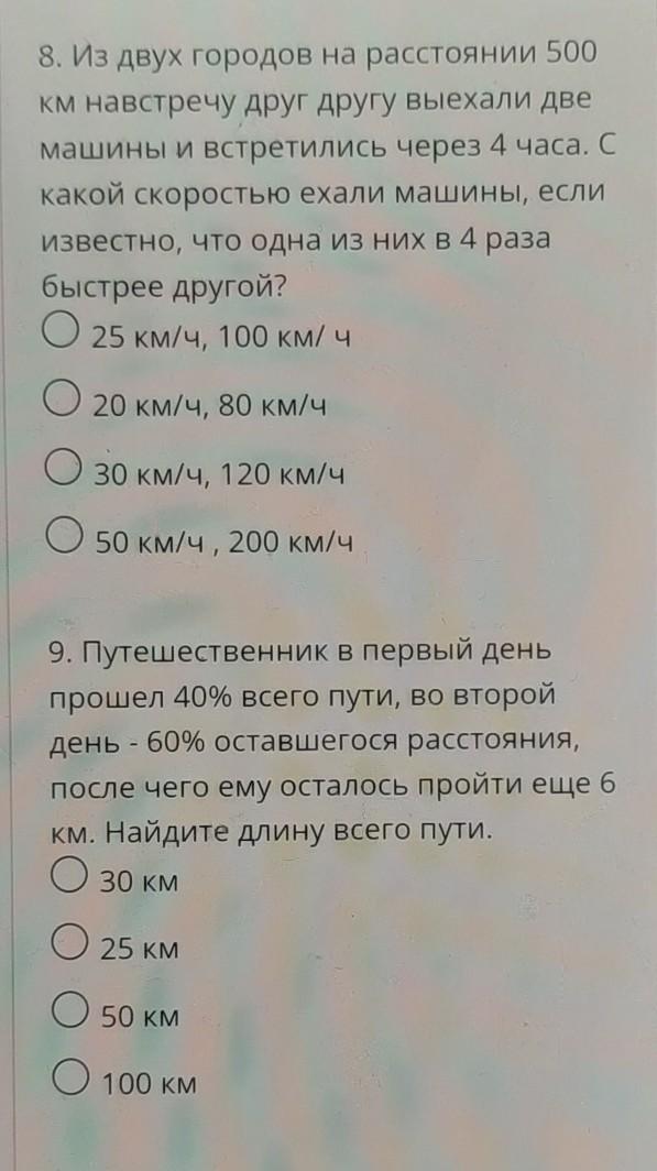 8. Из двух городов на расстоянии 500 км навстречу друг другу выехали две машины и встретились через 4 часа. С какой скоростью ехали машины, если известно, что одна из них в 4 раза быстрее другой? О 25 км/ч, 100 км/ ч О 20 км/ч, 80 км/ч О 30 км/ч, 120 км/ч О 50 км/ч, 200 км/ч 9. Путешественник в первый день прошел 40% всего пути, во второй день - 60% оставшегося расстояния, после чего ему осталось пройти еще км. Найдите длину всего пути. 6 О 30 км О 25 км 50 км 100 км