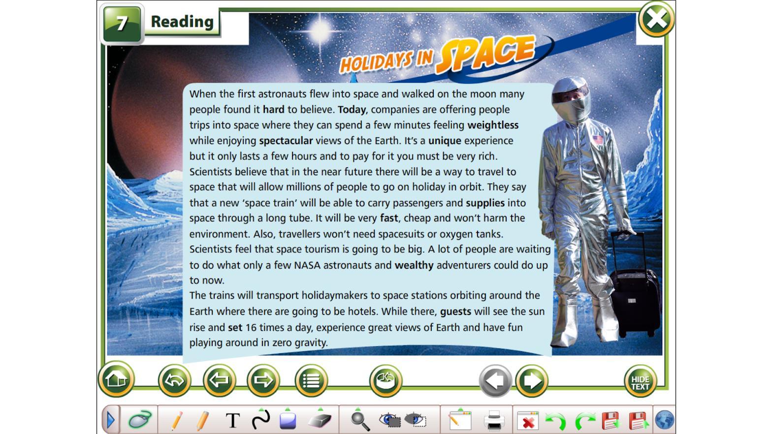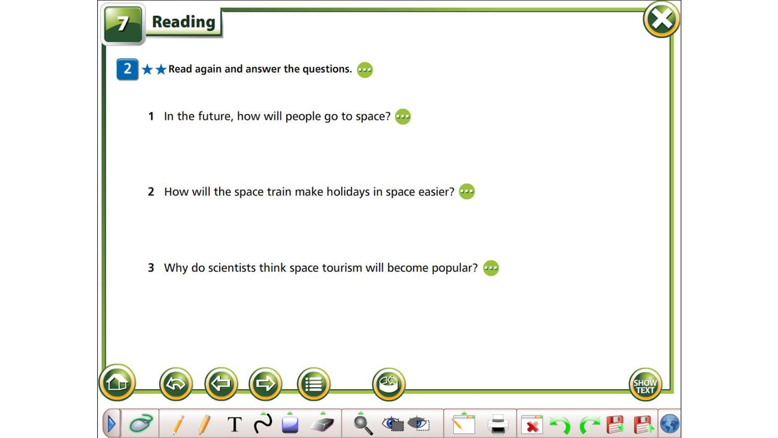 1)Probably ,people will go to space by using space trains ,what will can transport people in Earth orbit .