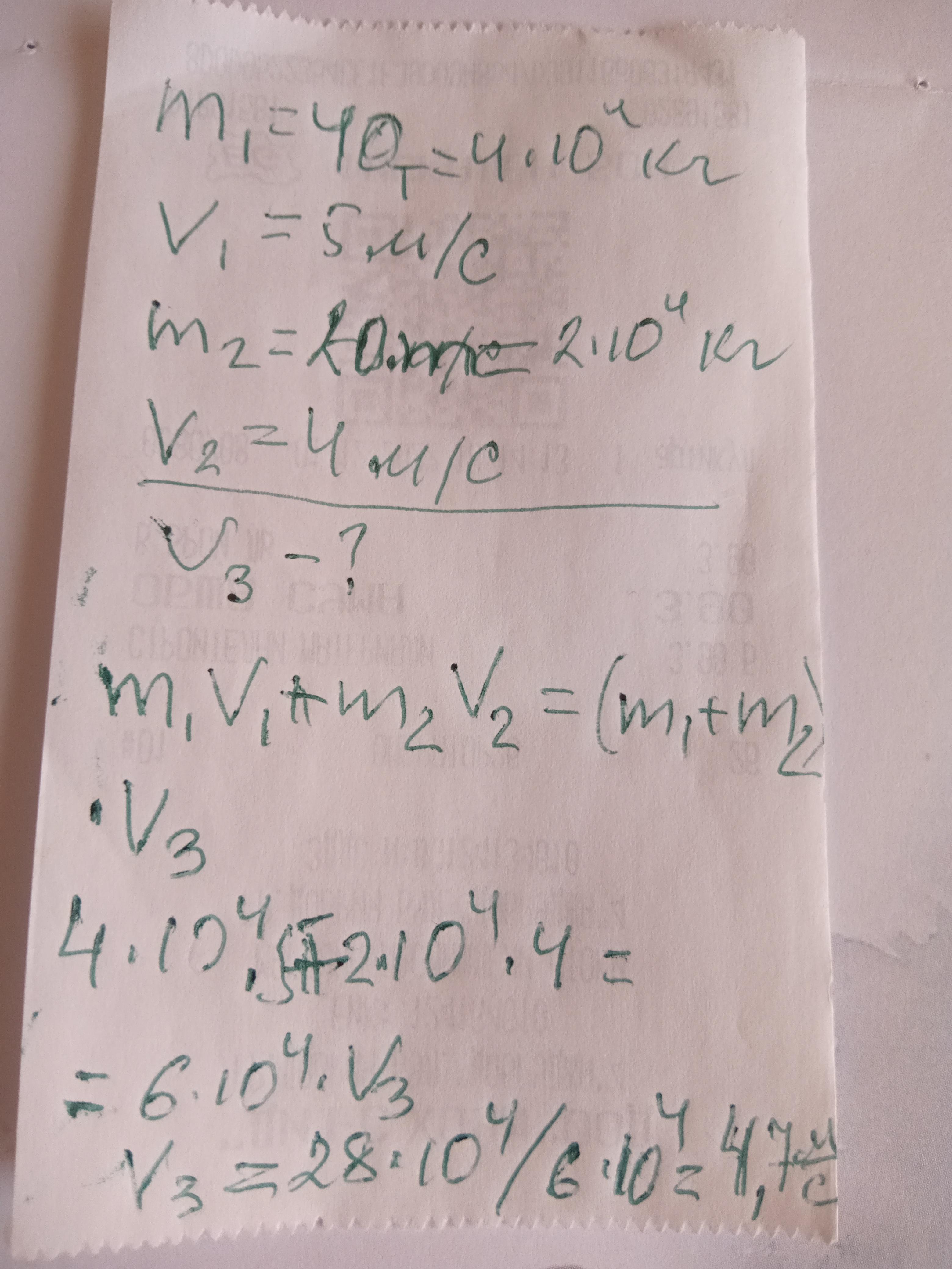 Два вагони, що рухаються назустріч один одному, зіткнулись та зчепились. Визначіть швидкість та напрямок руху такого зчеплення, якщо перший вагон масою 40 т рухався праворуч зі швидкістю 5 м/с, а другий вагон масою 20 т рухався ліворуч зі швидкістю 4 м/с. Втратами енергії під час руху та зіткнення знехтуйте.