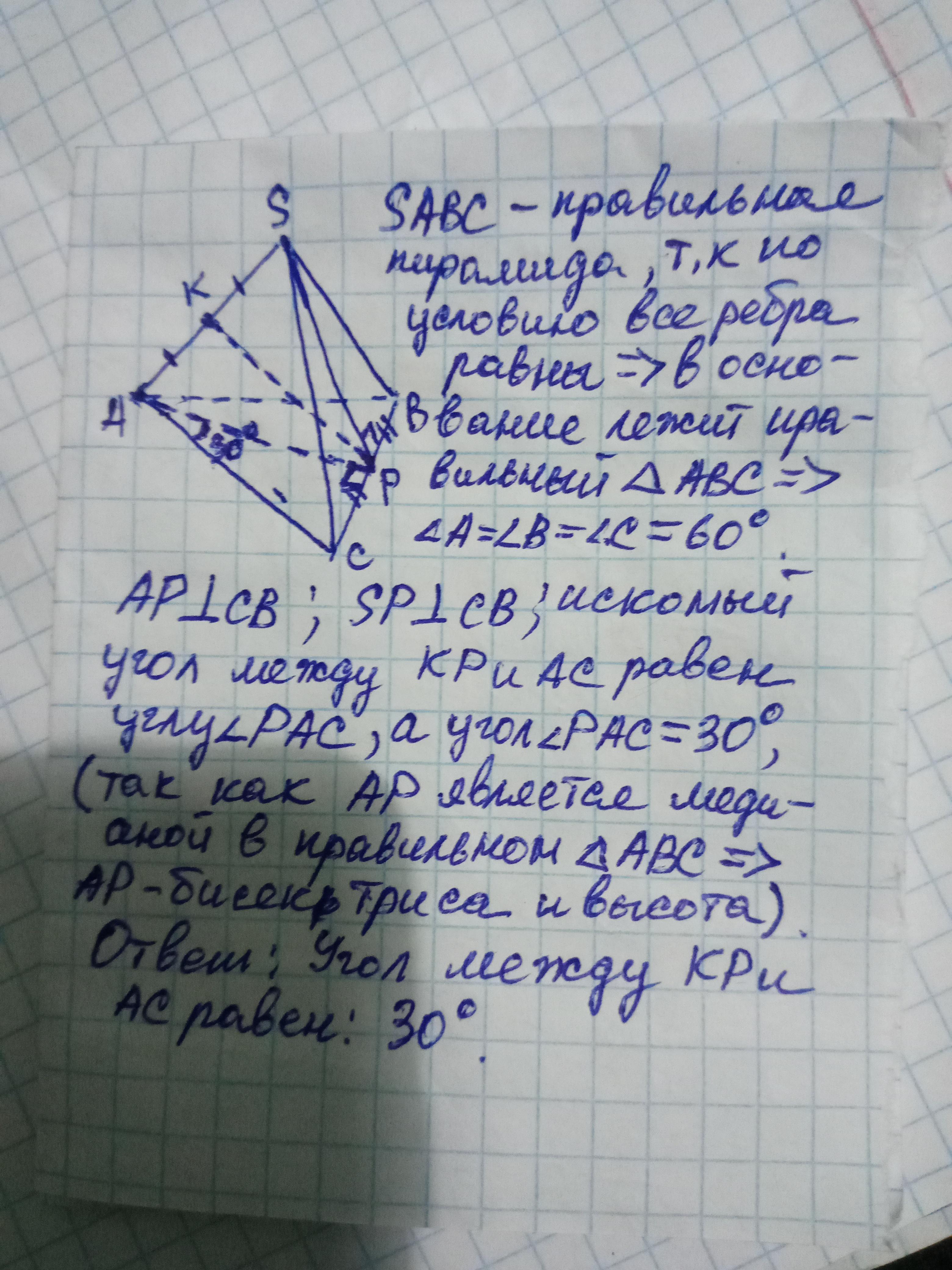 Побудуйте трикутну піраміду SABC, у якій всі ребра дорівнюють одне одному, позначте точки K i P середини ребер AS i BC вiдповiдно. Знайдіть кут між прямими: - KP і AS