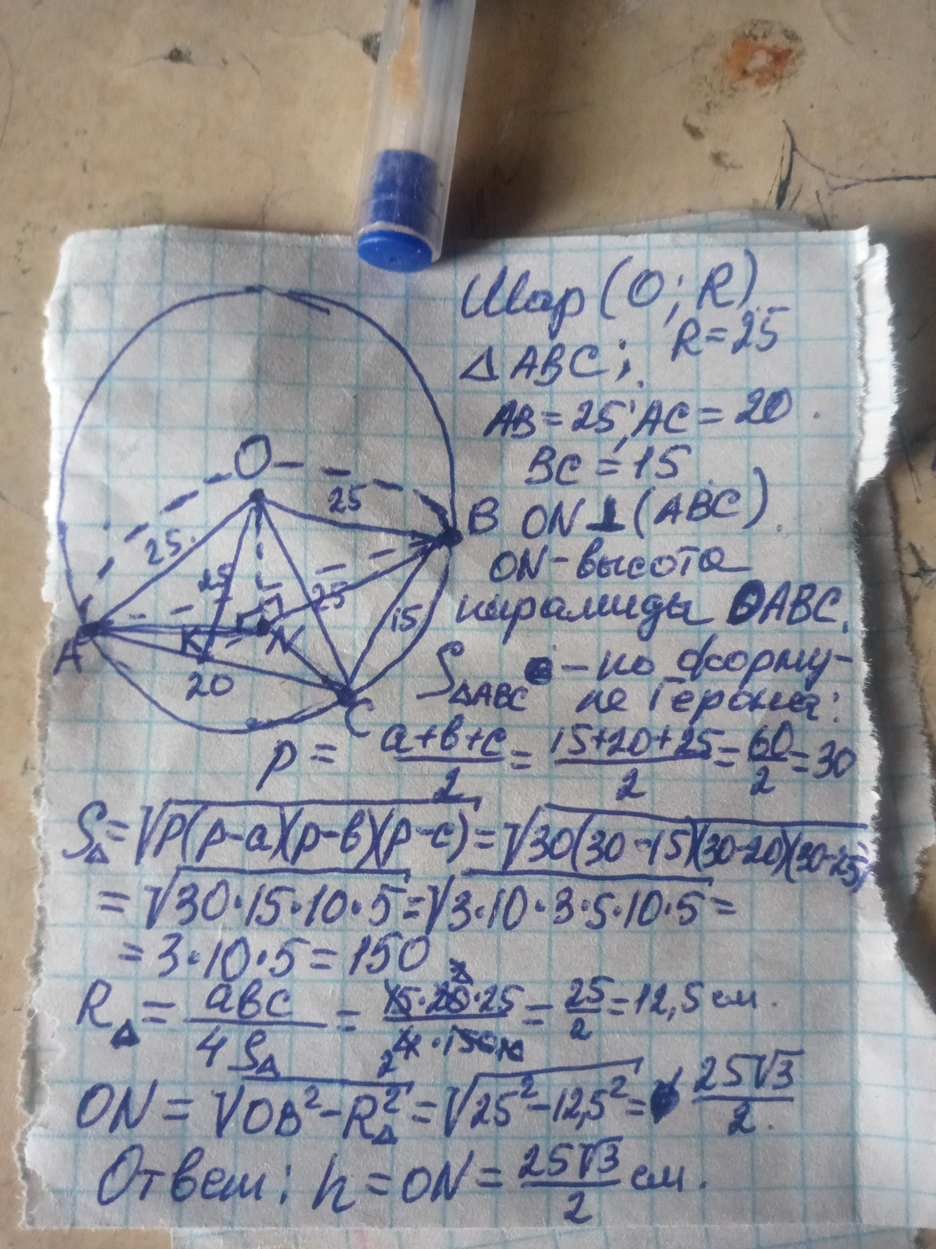 вершини трикутника зі сторонами 15, 20 і 25 лежать на поверхні кулі. Знайти відстань від центра кулі до площини трикутника, якщо радіус кулі 25 см.