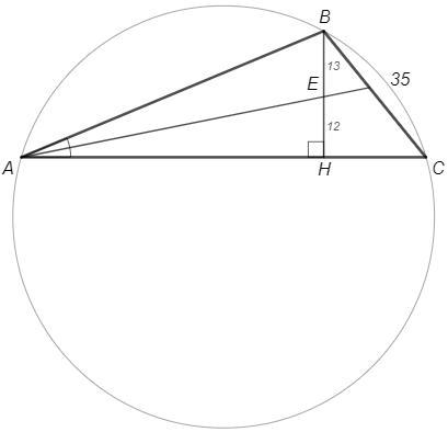 В треугольнике АВС биссектриса угла А делит высоту, проведённую из вершины В, в отношении 13 : 12, считая от точки В. Найдите радиус окружности, описанной около треугольника АВС, если ВС = 35.