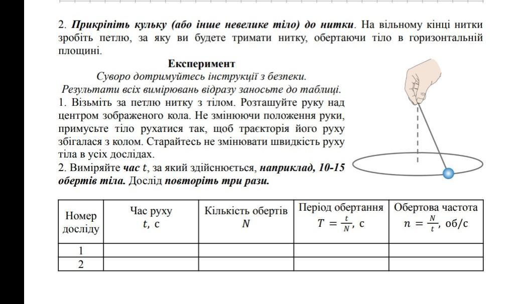 2. Прикріпіть кульку (або інше невелике тіло) до нитки. На вільному кінці нитки зробіть петлю, за яку ви будете тримати нитку, обертаючи тіло в горизонтальній площині. Експеримент Суворо дотримуйтесь інструкції з безпеки. Результати всіх вимірювань відразу заносьте до таблиці. 1. Вiзьмiть за петлю нитку з тілом. Розташуйте руку над центром зображеного кола. Не змінюючи положення руки, примусьте тіло рухатися так, щоб траєкторія його руху збігалася з колом. Старайтесь не змінювати швидкість руху тіла в усіх дослідах. 2. Виміряйте час t, за який здійснюється, наприклад, 10-15 обертів тіла. Дослід повторіть три рази. Номер досліду 1 2 Час руху t, c Кількість обертів | Період обертання | Обертова частота Т = 1, с = 1, об/с N n =