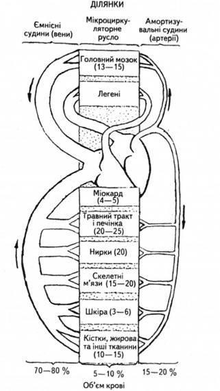 Резистивні, обмінні й шунтувальні судини утворюють мікроциркуляторне русло. Функціональну характеристику судин дають на прикладі великого кола кровообігу (мал. 104). Особливості кровотоку в малому колі викладено в окремому розділі.
