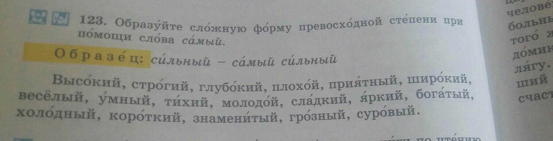 Самый высокий, самый строгий, самый глубокий, самый плохой, самый приятный, самый широкий, самый веселый, самый умный, самый тихий, самый молодой, самый сладкий, самый яркий, самый богатый, самый холодный, самый короткий, самый знаменитый, самый грозный, самый суворый.