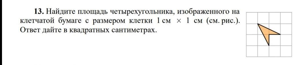 13. Найдите площадь четырехугольника, изображенного на клетчатой бумаге с размером клетки 1 см х 1 см (см. рис.). Ответ дайте в квадратных сантиметрах.