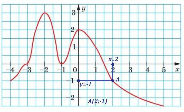 Чтобы найти f(2) , надо найти на оси ОХ точку, абсцисса которой х=2 . Затем восстановить перпендикуляр и этой точки до пересечения его с графиком функции y=f(x) . Получим точку А на графике . Затем из точки А опустить перпендикуляр на ось ОУ и посмотреть, какое значение у соответствует полученной точке на оси ОУ .