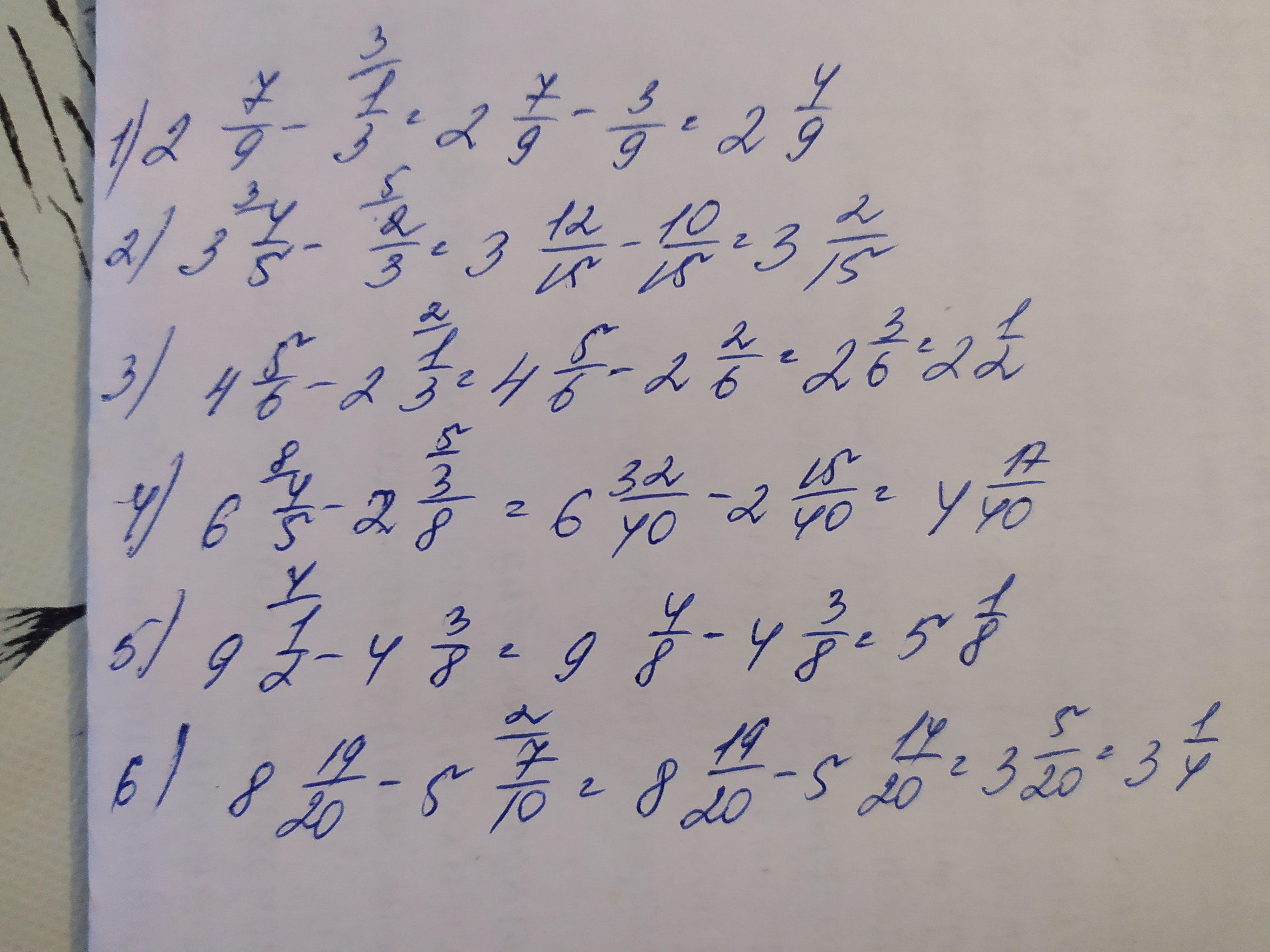 481. Вычислите 1)2 7/9-1/3. 2)3 4/5-2/3. 3)4 5/6-2 1/3 4)6 4/5-2 3/8. 5)9 1/2-4 3/8. 6)8 19/20-5 7/10