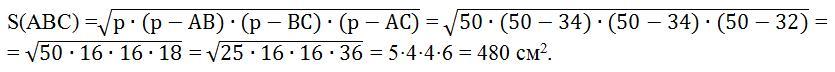 p = (AB+BC+AC)/2 = (34+34+32)/2 = 100/2 = 50 см.