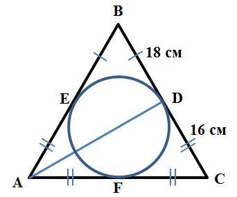вписаного кола ділиться на відрізки 18 і 16 см, починаючи від вершини.